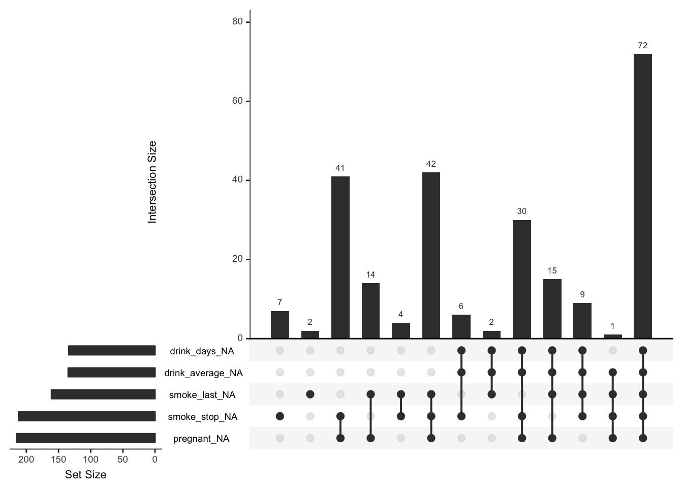On the left is a plot of the number of missings in each individual variable (missingness is indicated here with variable_NA), and then on the right we have the size of the missingness in the combinations of variables. So here we see that out of the variables selected, the largest number of missings is about 72. This means that there are 72 rows where all five of these variables are missing. You can decide to look at more possible sets of missings by changing the nsets option in upset to be the same as the number of variables with missings - using the new n_var_miss function: